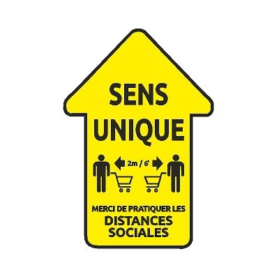 Article # FS01 – Panneau de signalisation / pictogramme. Autocollant adhésif. Dimensions: 24 x 35.5cm. Texte: « Sens Unique 2m/6′ Merci de Pratiquer les Distances Sociales »