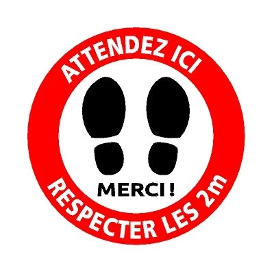 Article #FS04 – Panneau de signalisation / pictogramme. Autocollant adhésif. 35.5cm rond. Texte: « Attendez Ici. Respectez les 2m. Merci! »
